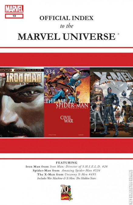 Continuing the chronicle of the Marvel Universe, starting with Spider-Man (from AMAZING SPIDER-MAN #523 on), Iron Man (from INVINCIBLE IRON MAN #2 on) and the X-Men (from UNCANNY X-MEN #514 on). Follow the history of the Marvel universe as it unfolds month by month with the all-new Official Index to the Marvel Universe. Each issue provides synopses for dozens of individual comics, including back-up strips, introducing you to the characters, teams, places and equipment that appeared within, providing vital information about first appearances, where they last showed up and where they appeared next!