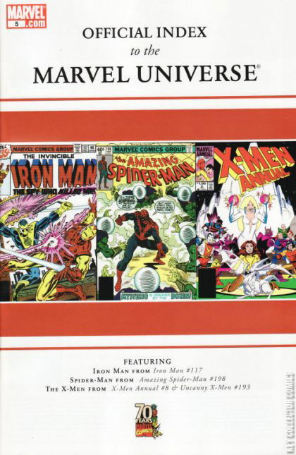 Continuing the chronicle of the Marvel Universe, starting with Spider-Man (from AMAZING SPIDER-MAN #198 on), Iron Man (from IRON MAN #117) and the X-Men (from X-MEN ANNUAL #8 & UNCANNY X-MEN #193 on). Follow the history of the Marvel universe as it unfolds month by month with the All-New Official Index to the Marvel Universe. Each issue provides synopses for dozens of individual comics, including back-up strips, introducing you to the characters, teams, places and equipment that appeared within, providing vital information about first appearances, where they last showed up and where they appeared next!
