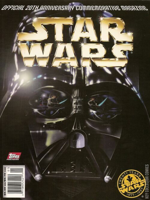 The Official Star Wars 20th Anniversary Commemorative Magazine was published by Topps in February 1997. The magazine explores the first two decades of the Star Wars franchise as well as the 1997 theatrical release of The Star Wars Trilogy Special Edition. In addition to the original newsstand edition, Topps published two variant covers of the magazine in the United States, one with gold lettering and one with blue lettering. These variants included bonus coverage of The Star Wars Trilogy Special Edition and came packaged with three collector cards. Titan Magazines published a UK version of the magazine in March 1997 under the title The Official Star Wars 20th Anniversary Commemorative Souvenir.