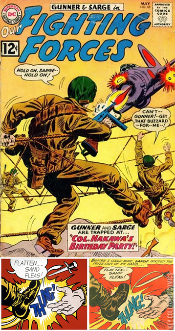 - Lower right image: interior panel illustrated by Irv Novick and written by Robert Kanigher that was swiped by pop culture artist Roy Lichtenstein without giving attribution to the original creators