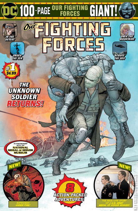 This issue includes these new stories: "Medal of Honor," an 8-page story featuring Batman written by Sal Giunta and Brad Meltzer with art by Jim Lee and Scott Williams To save a friend from seemingly insurmountable odds, the Dark Knight Detective my summon every ounce of his skill and bravery! This tale is based on the true story of U.S. Army Specialist Salvatore A. Giunta, who was awarded the Medal of Honor for his service in Afghanistan-the first living soldier to receive that honor during the Global War on Terrorism. "House Call," a 16-page story featuring the Unknown Soldier written by Christopher Priest with art by Christopher Mooneyham A cable news reporter with a mysterious U.S. Army tactical unit tries to figure out which one of the team's members is the immortal covert operative code-named the Unknown Solder-and discovers much more than she bargained for! "Code of Honor," an 8-page story featuring Batwoman written by Larry Hama with art by Mirko Colak Katherine Kane has worked hard to establish herself as one of Gotham's most intelligent and strategically cunning vigilantes. But before she was Batwoman, she was as West Point cadet-and when she gets drafted into a covert missiong as brigade XO, she'll need every bit of training that the Army gave her! New cover by Mikel Janin Plus, these reprint tales: "Frozen," from Men of War #4 (2012) "Knife Fight!," from Men of War #5 (2012) "A Last, Full Measure," from Men of War #6 (2012) "Remembering the Leopard," from Men of War #7 (2012) "Survival Mode," from Men of War #7 (2012)