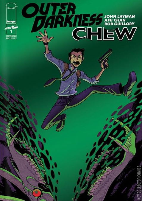SERIES PREMIERE! THE GREATEST CROSSOVER EVER! Tony Chu is a modern-day cop who gets psychic impressions from what he eats. Joshua Rigg is a 28th-century starship captain who flies through an outer space filled with demons, monsters, and ghosts. Sounds like a perfect recipe for a comic book crossover, don't it? Well, be careful what you wish for, because CHEW/OUTER DARKNESS is warping your way, bringing together the reunited multiple Eisner Award-winning CHEW team, writer JOHN LAYMAN and artist ROB GUILLORY, with OUTER DARKNESS' regular resident artistic genius, AFU CHAN!