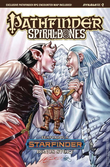 Cocksure fighter Valeros has shuffled off his mortal coil and now finds himself adrift in the cosmos beyond the living world of Golarion! Surrounded by angels and devils hungry for his soul, and without his resourceful friends, Valeros must survive his greatest adventure by his wits alone? a dire challenge indeed! The Spire of Bones story continues in this tale written by Pathfinder developer Crystal Frasier with art by Tom Garcia (Mercy Thompson, Pathfinder: Hollow Mountain). Contains a Pathfinder RPG rules appendix and a bonus pull-out poster map!