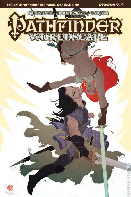 Into the Worldscape - Dynamite's fantasy adventure crossover event kicks off as the Pathfinders are drawn into the mysterious Worldscape, where the greatest warriors of Hyboria, Barsoom, Golarion and Earth clash in an ancient battle of life and death! Magic, monsters, and mystery co-starring Red Sonja! The Worldscape beckons in a tale written by Pathfinder publisher Erik Mona (Pathfinder: Hollow Mountain) with art from Jonathan Lau (Red Sonja and Cub). Contains a Pathfinder RPG rules appendix and a bonus pull-out poster map!