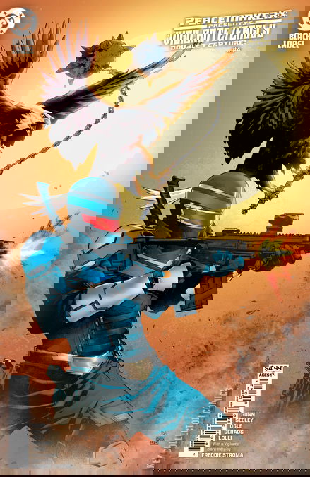 WHICH BEST FRIEND DIES FIRST?! DC Studios' James Gunn steps in as story consultant for five issues of insane $%&!@#$ calamity when two fan-favorite characters share the spotlight (and equal page count)! Well, fart noise. Peacemaker tried to be all tough in front of the pretty ladies and got himself impaled and may be dying. What a freakin' idiot. Luckily, his best friend and mentor--the magnificent and majestic Eagly--can back up his buddy. Which of course leads to victory! Yay! The good guys (can we call them good guys?) win!!! The end!!!! ...Oh. Wait. There's a traitor in their midst? Not good. All the while, our poor Adrian wants to kill some villains! But first, he's going to need to get through a whole lot of protection. This is a condom joke. Yes, we do an entire insane action scene in a scented prophylactic factory. Look what we've done to your beloved Eisner-winning Mitch Gerads now. An original DC Comics story inspired by James Gunn's visionary Peacemaker series on MAX, ya best get ready to rumble!