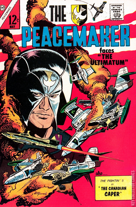 Cover art by Pat Boyette. The Survivors!, script by Joe Gill, art by Pat Boyette; Peacemaker stops a race of underground shape shifters from taking over the world. Peacemaker Patter article by Joe Gill, Ernie Bache; Dick Giordano; Writer Joe Gill and artist Ernie Bache write mini-bios of themselves, with accompanying Photographs. The Ultimatum, script by Joe Gill, art by Pat Boyette; Premier Gekk's army is stopped by Peacemaker. The Canadian Caper, script by Joe Gill, pencils by Bill Montes, script by Joe Gill, art by Bill Montes; The Fightin' 5 and their new female member travel to the Arctic to fight Russians.