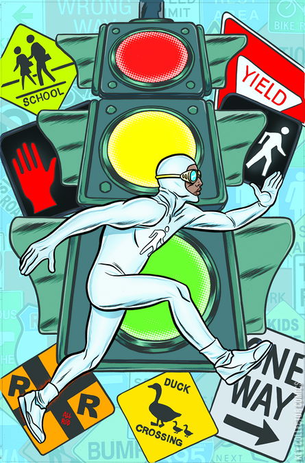 Joey Esposito (W) • Sean Von Gorman (A) • Mike Allred (CA) Behold, The Pedestrian! A strange visitor speedwalks into Summer City and silently changes the lives of its residents. But not all is quiet in this sleepy, small town—an ancient conflict linked to the secret history of street signs is brewing! DON’T WALK... RUN! In The Pedestrian, justice always has the right of way! Writer Joey Esposito (Batman: Urban Legends) reunites with Pawn Shop collaborator, artist Sean Von Gorman (Batman Beyond), for an offbeat tale that will stick with you!
