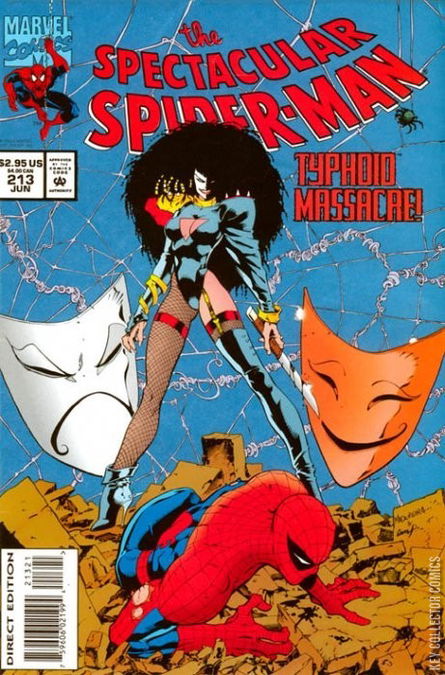 TYPHOID ATTACKS PART 1 After a busy night on patrol, Spider-Man when he hears a police siren alerting him of another crime. The wall-crawler decides to investigate it as Peter Parker. Changing out of his costume, he thinks about he hasn't been out of costume in a while and wonders if his alter-ego still has a job with the Daily Bugle. Parker manages to get onto the scene of the crime due to his press credentials. Even though the officers warn him that it is a gruesome scene, which he thinks he can handle until he actually sees it. He learns that the victim had a history of abusing women. All they know about the perpetrator is that this is their third victim and that they are being chosen due to. Learning that they have a witness, Peter decides to ask her his own questions. The witness is a meek young woman named Mary Walker, who claims to have witnessed the whole thing from a hole in the wall between their apartments. She talks about the killer being a confident and strong woman who knew what she was doing. However, the police don't buy her story and think she might have been involved. Peter believes her story and invites her over to his place for dinner so she can talk to his wife Mary Jane, who at listening. Mary likes this idea and accepts Peter's phone number. Later, Peter changes back to Spider-Man and returns home to discover that his wife is not home. With a serial killer on the loose, he wants to go back out to look for them. With no clean costumes, he uses one of Mary Jane's spandex t-shirts to bind the tears in his costume. He checks the voice mail and finds a message from Mary Jane. She is concerned about Peter and wants him to get in touch with her as soon as possible to let her know that he is okay. He feels bad for going back out and leaves her a message telling him his fine and giving her the heads up on their dinner guest before going back out. Elsewhere, in Mary's apartment, she looks over the various pills that she has to take on a regular basis. She feels fine and lashes out, thinking that she feels fine. She begins going through her artwork and becomes disturbed by some of the gruesome and graphic images among her actual work. She also finds a shotgun in her bag as well as police reports about men in the New York area that have a past history of abusing women. As she reads one of the reports, she puts her finger in a shattered bottle of black paint and runs a line down the middle of her face. After reading about the man's numerous offenses, she wishes that someone would do something about it. By this time, Mary Jane has returned home with dinner and is disappointed when Peter isn't home. She then gets a phone call from Mary Walker who is lost and asking for directions. Mary Jane actually looks forward to talking to another woman and gives her directions. Mary tells her that she is also looking forward to having a girl talk. A short time later, Mary Jane answers a knock at the door and is horrified to see the vigilante known as Typhoid Mary waiting on the other side. Inviting herself in, Typhoid notices the dinner that is growing cold on the table. She quickly understands that her husband Peter has stood her up, and not for her first time. She then begins to mock Mary Jane, painting her as a dutiful housewife. When Mary Jane tries to defend herself and her marriage, Typhoid mocks her further before using her telekinetic powers to trash the room before leaping out a window. In the aftermath of this attack, Mary Jane wonders who that woman was, and how she knows her husband. Soon, Spider-Man returns home and sees the state of his home and asks Mary Jane what happened. After hearing her explanation, the wall-crawler figures that Typhoid is the vigilante killing men across the city. He tells Mary Jane to go someplace safe while he goes after her. Having not made the connection between Mary Walker and Typhoid Mary, Mary Jane decides to wait for Mary to show up before leaving. Before the wall-crawler leaves, Mary Jane tells Peter that in order to catch a killer he has to be able to think like one, but warns him that he can't be like one. Meanwhile, Typhoid Mary arrives at a dive bar, gaining the attention of the lechers who are drinking there. Her presence attracts the attention of Spider-Man who is swinging by as she tosses one of the drunks out of the bar window. She attacks Spider-Man, who is reluctant to hit a woman, even one that can somehow evade his spider-sense. The wall-crawler is convinced that Typhoid Mary is the serial killer. When he strikes her, she begins to cry and blames him for being abusive like all other men. This accusation causes Spider-Man to take pause long enough for Mary to attack him. As the fight continues, the web-slinger accuses her of killing men. Typhoid Mary denies this and flees from the scene. However, she is confused as to why she is running away. Spider-Man follows after her, wondering what she is up to. Suddenly, Typhoid collapses to the ground. Suddenly, she uses her telekinetic powers to wrap herself in metal. Spider-Man quickly realizes that Typhoid Mary is developing another split personality. This new persona, Bloody Mary, arms herself with a sniper rifle and goes after her next target Jack Morray. However, as she pulls the trigger, Spider-Man kicks the gun, spoiling her shot. As the wall-crawler tries to subdue Mary, he notices that even her fighting style is different. She accuses the wall-crawler of being another abuser of women, but Spider-Man refuses to be judged by a lunatic. He tries to snare her in his webbing, but this new persona has the power of pyrokenesis to burn through the webbing. As she gets away, Spider-Man manages to tag her with a spider-tracer. Trying to make sense of this encounter, Spider-Man quickly realizes that Mary Walker, Typhod Mary, and Bloody Mary are all the same person. He fears that Mary might return to his home to terrorize Mary Jane and leaps after her.
