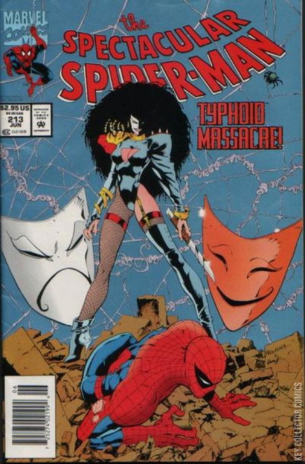 TYPHOID ATTACKS PART 1 After a busy night on patrol, Spider-Man when he hears a police siren alerting him of another crime. The wall-crawler decides to investigate it as Peter Parker. Changing out of his costume, he thinks about he hasn't been out of costume in a while and wonders if his alter-ego still has a job with the Daily Bugle. Parker manages to get onto the scene of the crime due to his press credentials. Even though the officers warn him that it is a gruesome scene, which he thinks he can handle until he actually sees it. He learns that the victim had a history of abusing women. All they know about the perpetrator is that this is their third victim and that they are being chosen due to. Learning that they have a witness, Peter decides to ask her his own questions. The witness is a meek young woman named Mary Walker, who claims to have witnessed the whole thing from a hole in the wall between their apartments. She talks about the killer being a confident and strong woman who knew what she was doing. However, the police don't buy her story and think she might have been involved. Peter believes her story and invites her over to his place for dinner so she can talk to his wife Mary Jane, who at listening. Mary likes this idea and accepts Peter's phone number. Later, Peter changes back to Spider-Man and returns home to discover that his wife is not home. With a serial killer on the loose, he wants to go back out to look for them. With no clean costumes, he uses one of Mary Jane's spandex t-shirts to bind the tears in his costume. He checks the voice mail and finds a message from Mary Jane. She is concerned about Peter and wants him to get in touch with her as soon as possible to let her know that he is okay. He feels bad for going back out and leaves her a message telling him his fine and giving her the heads up on their dinner guest before going back out. Elsewhere, in Mary's apartment, she looks over the various pills that she has to take on a regular basis. She feels fine and lashes out, thinking that she feels fine. She begins going through her artwork and becomes disturbed by some of the gruesome and graphic images among her actual work. She also finds a shotgun in her bag as well as police reports about men in the New York area that have a past history of abusing women. As she reads one of the reports, she puts her finger in a shattered bottle of black paint and runs a line down the middle of her face. After reading about the man's numerous offenses, she wishes that someone would do something about it. By this time, Mary Jane has returned home with dinner and is disappointed when Peter isn't home. She then gets a phone call from Mary Walker who is lost and asking for directions. Mary Jane actually looks forward to talking to another woman and gives her directions. Mary tells her that she is also looking forward to having a girl talk. A short time later, Mary Jane answers a knock at the door and is horrified to see the vigilante known as Typhoid Mary waiting on the other side. Inviting herself in, Typhoid notices the dinner that is growing cold on the table. She quickly understands that her husband Peter has stood her up, and not for her first time. She then begins to mock Mary Jane, painting her as a dutiful housewife. When Mary Jane tries to defend herself and her marriage, Typhoid mocks her further before using her telekinetic powers to trash the room before leaping out a window. In the aftermath of this attack, Mary Jane wonders who that woman was, and how she knows her husband. Soon, Spider-Man returns home and sees the state of his home and asks Mary Jane what happened. After hearing her explanation, the wall-crawler figures that Typhoid is the vigilante killing men across the city. He tells Mary Jane to go someplace safe while he goes after her. Having not made the connection between Mary Walker and Typhoid Mary, Mary Jane decides to wait for Mary to show up before leaving. Before the wall-crawler leaves, Mary Jane tells Peter that in order to catch a killer he has to be able to think like one, but warns him that he can't be like one. Meanwhile, Typhoid Mary arrives at a dive bar, gaining the attention of the lechers who are drinking there. Her presence attracts the attention of Spider-Man who is swinging by as she tosses one of the drunks out of the bar window. She attacks Spider-Man, who is reluctant to hit a woman, even one that can somehow evade his spider-sense. The wall-crawler is convinced that Typhoid Mary is the serial killer. When he strikes her, she begins to cry and blames him for being abusive like all other men. This accusation causes Spider-Man to take pause long enough for Mary to attack him. As the fight continues, the web-slinger accuses her of killing men. Typhoid Mary denies this and flees from the scene. However, she is confused as to why she is running away. Spider-Man follows after her, wondering what she is up to. Suddenly, Typhoid collapses to the ground. Suddenly, she uses her telekinetic powers to wrap herself in metal. Spider-Man quickly realizes that Typhoid Mary is developing another split personality. This new persona, Bloody Mary, arms herself with a sniper rifle and goes after her next target Jack Morray. However, as she pulls the trigger, Spider-Man kicks the gun, spoiling her shot. As the wall-crawler tries to subdue Mary, he notices that even her fighting style is different. She accuses the wall-crawler of being another abuser of women, but Spider-Man refuses to be judged by a lunatic. He tries to snare her in his webbing, but this new persona has the power of pyrokenesis to burn through the webbing. As she gets away, Spider-Man manages to tag her with a spider-tracer. Trying to make sense of this encounter, Spider-Man quickly realizes that Mary Walker, Typhod Mary, and Bloody Mary are all the same person. He fears that Mary might return to his home to terrorize Mary Jane and leaps after her.
