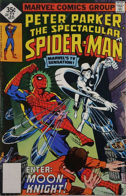 BY THE LIGHT OF THE SILVERY MOON KNIGHT! Moon Knight, on the heels of a criminal named Lindy, tries to prevent his assassination so that he can testify against the Maggia during a trial. In spite of his best efforts, the Maggia agents manage to kill their target. Meanwhile, Peter Parker arrives home after web-slinging and gets ready just as Betty Brant arrives for their date. Elsewhere, Flash spends time with Sha Shan and Hector Ayala laments his lot in life being the White Tiger. Later that night, as Moon Knight (in his Jack Lockley identity) and Frenchie look for clues to help them bust the Maggia, Spider-Man web-slings across town. His spider-sense alerts him to several gunmen within Gena Lander's diner who are looking for Lockley. Spider-Man interferes and saves Gina and Crawley from being killed by the gunmen, however, one of them manages to flee. When Spider-Man catches up with the hood, he finds that Moon Knight has found him first and is roughing him up. Confusing Moon Knight as a villain trying to kill the man, the two get into a brief battle long enough for the crook to call in support from the Maggia, who sends in their super-powered agent Cyclone to deal with the two costumed heroes.