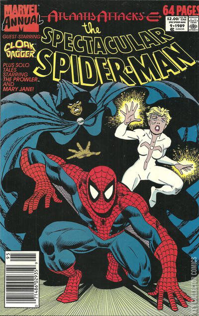 ATLANTIS ATTACKS CHAPTER VI - THE SERPENT IN THE SHADOW Spider-Man has gone to the West Side Armory, where the Save Our Society organization has set up operations. The hero had recently seen a television news report about its founder, Doctor Tyrone, who has been miraculously curing drug addicts, and alcoholics. Thinking that Tyrone might be a fraud, Spider-Man goes to check it out and snap some photos for the Daily Bugle. However, when he arrives he is surprised to see a large crowd of New York City's downtrodden lined up to see Doctor Tyrone. Still, he decides to sneak inside and take pictures, as he hasn't be able to sell photos to the Bugle for a while. Inside, Spider-Man witnesses as Doctor Tyrone manages to cure a drug addict with a single injection. As Spider-Man watches this play out, he catches a glimpse of Cloak watching from the window outside. Spider-Man goes outside to see why Cloak has come to witness this gathering as well. The vigilante tells Spider-Man that he is here for personal reasons and teleports away. As Spider-Man tries to make sense of going on, he is unaware that he is being watched by a being wearing a suit of armor. Spider-Man then spots Cloak inside the building. Before he can do anything, Spider-Man has to dodge a barrage of light knives fired at him by Cloak's partner, Dagger. Spider-Man leaps toward her, demanding to know why she has attacked him. Dagger believes that Spider-Man is trying to harm Cloak. Spider-Man tries to explain that he means no harm when Cloak returns, wrapping the wall-crawler in his cloak and teleports away, leaving Dagger alone. Dagger is left to wonder where the two men have gone, and can't shake the feeling that someone is watching her. She is not wrong, as she is being observed by the Deviant priest known as Ghaur. He has decided that she will be a perfect candidate for the Brides of Set. He tells his minions to have Tyrannus capture her, and leaves to continue working on constructing a new Serpent Crown. Meanwhile, Spider-Man is in the throes of a nightmare while traveling inside the Dark Dimension. He is soon dumped in Central Park by Cloak, who apologizes for the horrible visions the wall-crawler has witnessed, but he couldn't have the hero harm Dagger. Cloak quickly departs leaving Spider-Man in the care of people camping out in the park. After the web-slinger recovers from his ordeal, he ask the people why they are camping in Central Park. They explain that they are homeless and have nowhere to go. Spider-Man asks what they will do if they are driven from the park, and they tell him that they plan on going to the Save Our Society shelter. After he is fully recovered, Spider-Man thanks the homeless people for their help and swings away. As he leaves, he thinks about how he and his wife Mary Jane don't have it quite so bad not having a home of their own since they have Aunt May's place to stay. Later, at the Holy Ghost Church, Cloak returns to Dagger and explains that he went to Doctor Tyrone's shelter in the hopes of using his miracle cure to end his constant hunger. However, he thinks to himself that it is a foolish dream, as he feels that Dagger would leave him if he was no longer cursed and relied on her to sustain his tortured existence. He tells Tandy that he needs to be alone for a while and teleports away. Dagger wonders why Cloak can be so blind as to see that she doesn't love him, and that she loved him since the day they met. She recounts how the pair of them were runaways that were kidnapped by drug dealers who used them as test subjects for a new experimental drug that gave them their powers. Her thoughts are interrupted by the arrival of "Doctor Tyrone" who is actually Tyrannus. He uses Lemurian technology to knock Dagger out and take her prisoner. He then has his Deviant allies to load her up in their ship and take her off to see Ghaur. Meanwhile, Peter Paker is at the Daily Bugle developing his photos of the Save Our Society gathering. Taking a look at a photo of one of Doctor Tyrone's assistants, he notices a strange dragon-shaped tattoo on his wrist and decides to pay the shelter another visit. On his way out, he catches a news report about Atlantean attacks across the United States. Changing into Spider-Man, the hero wonders if the world is going crazy. He recalls of his recent battle with the Abomination alongside the She-Hulk. As the wall-crawler web-slings across the city he runs into Cloak. Knowing that Dagger is in danger has put Cloak into a frenzy. Spider-Man calms Cloak down, and he shows Spider-Man a note that was left for him at the Holy Ghost Church telling him to go to the shelter. Spider-Man explains that he was heading there himself and agrees to help Cloak rescue Dagger. Arriving at the shelter, Spider-Man goes in through the window, telling Cloak to attack from above. As they prepare for action, they are once more observed by the mysterious man in armor. Inside, Spider-Man finds Brother Elton, the man with the strange tattoo and follows after him. Meanwhile, Cloak uses his power of intangibility to float through the building into the room where Tyrannus is keeping Dagger prisoner. Tyrannus uses his powers to enthralls Cloak and tells him to procure a mystical book in Paris and bring it back. Unable to resist the power of Tyrannus, Cloak ends up teleporting that away to do just that. Elsewhere, Spider-Man comes across many of the shelter's drug addicts strapped to gurneys and wonders what is going on. Deciding to find out why Spider-Man continues his pursuit of Brother Elton. While below, Cloak returns with the Book of Kell an ancient text written by the Sons of the Serpent Cult. He hopes to use the book to gain more power than Ghaur. To repay Cloak for his assistance, he tells his minions to kill them. The attackers remove their cloaks revealing themselves to be Serpent Men. The shock of seeing the creatures shakes Cloak free of his trance. Cloak begins sending some of the Serpent Men through 