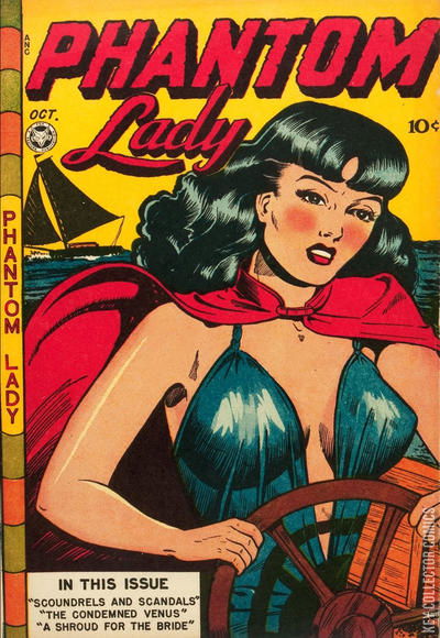 "Scoundrels and Scandals," art by Matt Baker; Sandra's father sends her to a stamp auction to bid on the famed Piedmont Collection of rare Haitian stamps; Although she loses the bidding, the winner has his pocket picked of his cash and Sandra wins by default; When her purse is picked on the way home, Phantom Lady decides to investigate. "The Haunted Hepcats" text story by Roy Thomas. "Condemned Venus!", art by Matt Baker; Sandra picks up an old friend of hers along a street during a rainstorm, noticing that she is acting strangely; Just then, the police show up and arrest Kitty for murder; The Phantom Lady knows that Kitty is innocent and begins an investigation to discover just who is framing her for the crime. "A Shroud for the Bride!", art by Matt Baker; Popular Porky Mead, a real ladies' man, has several women in suspense as to who he will take to the masquerade party; In desperation, however, Porky decides to take a diner waitress named Rosie, who ends up murdered; Phantom Lady must find the killer of Porky Mead's date.