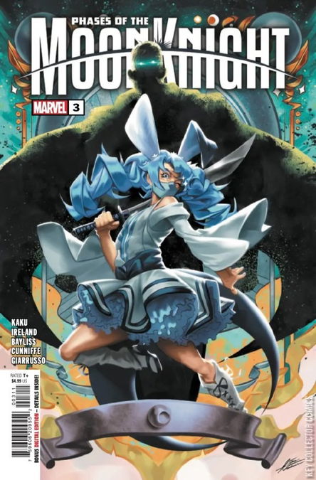 Fall into the next PHASES OF THE MOON KNIGHT alongside New York Times best-selling Author JUSTINA IRELAND as she weaves a tale of an ALL-NEW avatar of Khonshu that might just eclipse every other Fist of Khonshu that came before! Plus! Don't miss the Marvel debut of manga superstar YUJI KAKU (HELL'S PARADISE) as he introduces a brand new Moon Knight with a violent past from a magical future!