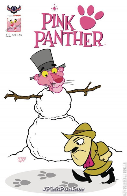 It's a blizzard outside! But this isn't a whiteout; it's a 'pinkout!' We're home from school today and scaring up some winter fun with everyone's favorite Pink Panther. How much trouble can your favorite cool cat get into on a snowy day? Whether it's dumping The Little Man in a frozen lake or confounding The Inspector, the Pink Panther has new hijinks that will make you laugh out loud! Get your winter coat and mittens; it's time for a Pink Panther Snow Day! Main Wraparound cover by Adrian Ropp, 'Pink HiJinks' cover by Jacob Greenawalt, Classic Pink cover by Bill Galvan, and a special Retro Animation Premium Cover.