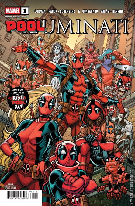 THE ELITE 'POOLS ASSEMBLE! There are those who hold power, and those who hold the secret power in the world. Those who shape the world around us, who pull the strings, unseen. They are...the POOLUMINATI. Or, wait, no, that's the Illuminati, so what the heck does the Pooluminati do? It's TOO SECRET...but WADE WILSON is ABOUT TO FIND OUT! The most elite DEADPOOLs across the Multiverse assemble, and they need the 616's Deadpools. But will Wade (with Ellie's help) prove himself worthy of the Pooluminati? And even if he does...will the conspiracy theory they uncover spell disaster for 'Pools everywhere? PLUS: A Princess and Elliepool short by by Quasarano/Bal�m! PARENTAL ADVISORY