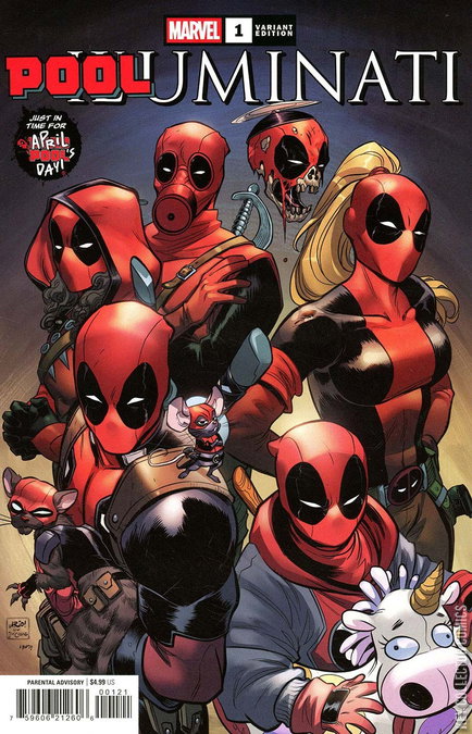 THE ELITE 'POOLS ASSEMBLE! � There are those who hold power, and those who hold the secret power in the world. Those who shape the world around us, who pull the strings, unseen. They are�the POOLUMINATI. Or, wait, no, that's the Illuminati, so what the heck does the Pooluminati do? It's TOO SECRET�but WADE WILSON is ABOUT TO FIND OUT! � The most elite DEADPOOLs across the Multiverse assemble, and they need the 616's Deadpools. But will Wade (with Ellie's help) prove himself worthy of the Pooluminati? And even if he does�will the conspiracy theory they uncover spell disaster for 'Pools everywhere? � PLUS: A Princess and Elliepool short by by Quasarano/Bal�m! PARENTAL ADVISORY