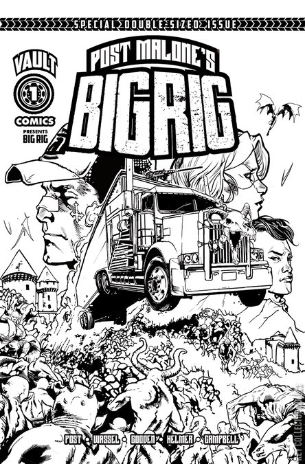 The sold out first issue returns for a second printing! Double-length — collects chapters 1 & 2! Post Malone’s BIG RIG. THEY PRAYED FOR A MIRACLE. THEY GOT 25 TONS AND 18 WHEELS OF HOLY WEAPON. The Dark Ages…Demon hordes plague Europe as Hell invades Earth. The Six Petals, a secret sect of The Knights Templar, are in desperate need of a means to drive back the scourge and turn the tide of the onslaught. What crashes to earth is The Rig, a fully loaded tractor trailer. In the aftermath of its arrival, the only man left standing is an enigmatic former priest excommunicated from The Six Petals. He will become Trucker and lead the fight against Hell behind the wheel of a demon-slaying machine. Created by Post Malone. Written by Post Malone and Adrian Wassel. Drawn by Barbaric co-creator and Dark Knights of Steel artist Nathan Gooden.