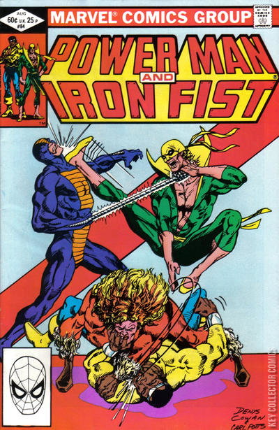 At last the identity of Slasher (a serial killer from Power Man and Iron Fist #78) is revealed. Power Man and Iron Fist are in the fight of their lives against the life-crushing coils of the Constrictor and Sabretooth, one of the deadliest men alive.