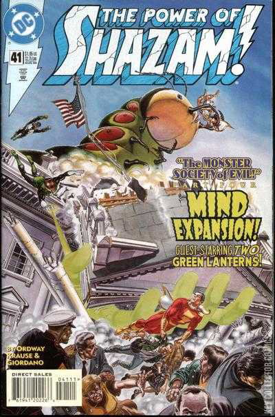 A Mr. Mind is a terrible thing to waste. Grown to gargantuan size, Mr. Mind terrorizes Washington, D.C. until the two Captains Marvel team up with the two Green Lanterns, Hal Jordan and Kyle Rayner! "The Monster Society of Evil" part 4.Captain Marvel and his allies are facing off against a horrible monstrosity while Green Lantern faces a powerful opponent of his own. Or so it seems. Both heroes are fighting each other. Can they figure out what is happening before it's too late?
