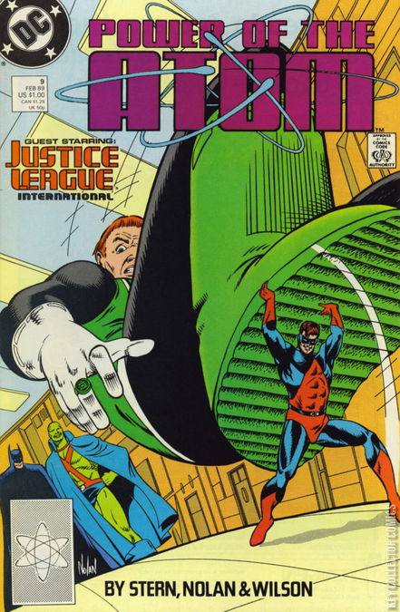 Cover by Graham Nolan.Written by Roger Stern, penciled by Graham Nolan, inked by K. S. Wilson, colored by Nansi Hoolahan and lettered by Albert De Guzman.Martian Manhunter wants The Atom to join the JLI, but the new lineup, who he calls "jerks", doesn't encourage him one bit. The appearance of a drunken conga line, lead by Guy Gardner, makes his case for him.Meanwhile Batman is trying to recruit Hal Jordan. The Atom interrupts him to tell Jordan to think about it. They are also interrupted by Gardner's conga-line, and then by G'Nort. The Atom leaves while he is still sane.Later, he stops a drunk driver from plowing into a crowd. He later keeps an unruly crowd from rioting.He returns to Ivy University to a surprise party.