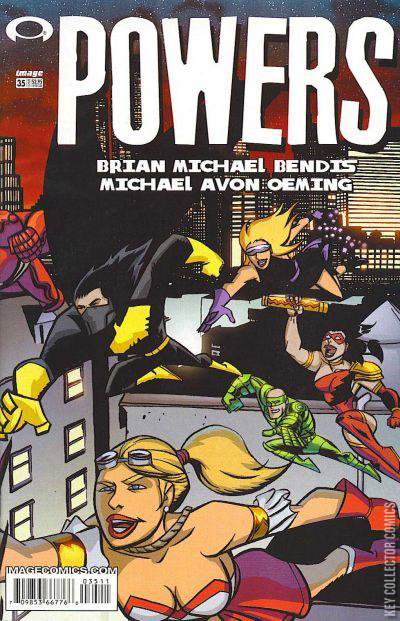 Homicide Detective Christian Walker and Deena Pilgrim investigate murders specific to superhero cases. Investigations that takes them from the seediest underbelly of the city, to the gleaming towers that are home to immortal beings. From the EISNER award winning team of Brian Michael Bendis (Ultimate Spiderman titles, Daredevil, Alias) and artist Mike Avon Oeming (Bastard Samurai). This year Bendis scored the comic book trifecta by winning the Wizard Fan Award, Comics Buyer's Guide Fan Award and Eisner Award for 'Best Writer.' FOREVER PART FIVE. THE POWERS SECRETS REVEALED!! Remember the eighties? Wrap around covers? Big, big Superhero events where things actually happened? Well, in this issue of powers, its all back!! It's the story you've been waiting for! All your powers favorites...