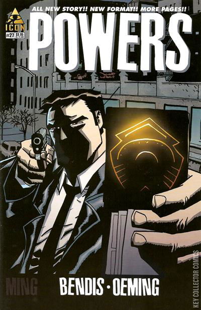 "THE 25 COOLEST DEAD SUPER HEROES OF ALL TIME" Part Three. POWERS IS BACK!! AND BIGGER THAN EVER!!! MORE PAGES, NEW FORMAT!! AND A SERIES OF DEADLY MYSTERIES THAT WILL ROCK THE POWERS UNIVERSE!! Homicide detectives Christian Walker and Deena Pilgrim investigate murders specific to super hero cases, and they both have a secret: They both have powers. A powers virus is tearing through the city. Young people are disappearing in the night and waking up dead... in costumes. Walker has a new partner and no leads, and what could Deena Pilgrim's connection to all of this be. From the writer of some of your favorite Marvel comics (ULTIMATE SPIDER-MAN, NEW AND MIGHTY AVENGERS) comes a brand-new chapter from this award-winning book.
