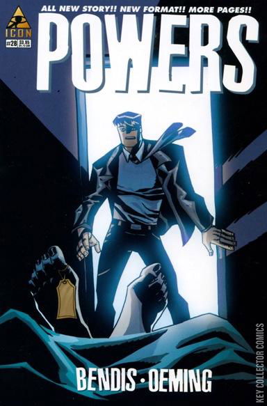 "THE 25 COOLEST DEAD SUPER HEROES OF ALL TIME" Part Three. POWERS IS BACK!! AND BIGGER THAN EVER!!! MORE PAGES, NEW FORMAT!! AND A SERIES OF DEADLY MYSTERIES THAT WILL ROCK THE POWERS UNIVERSE!! Homicide detectives Christian Walker and Deena Pilgrim investigate murders specific to super hero cases, and they both have a secret: They both have powers. A powers virus is tearing through the city. Young people are disappearing in the night and waking up dead... in costumes. Walker has a new partner and no leads, and what could Deena Pilgrim's connection to all of this be. From the writer of some of your favorite Marvel comics (ULTIMATE SPIDER-MAN, NEW AND MIGHTY AVENGERS) comes a brand-new chapter from this award-winning book.