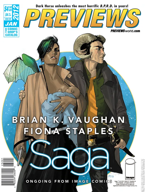 - Distributor solicitation catalog featuring the cover art of Saga #1 on one side and Fairest #1 on the other