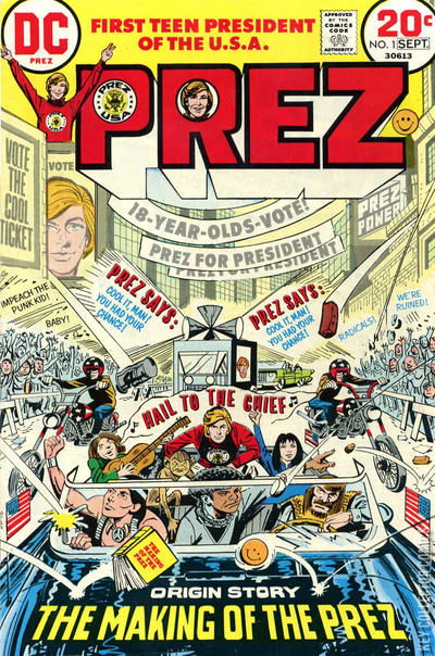 An artifact of its time. Boss Smiley attempts to find a candidate that will be his puppet, but Prez, with Eagle Free's help declares his independence. Inspired by the recent (1973) amendment lowering the U.S. voting age to 18, this story imagines the first teen-aged president. Full of hilariously off-key renderings of the 60s-70s youth culture.