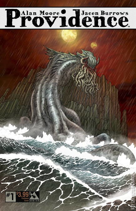 The most important work of 2015 begins here with the long-awaited arrival of Alan Moore's breathtaking epic PROVIDENCE with his artistic partner Jacen Burrows. In his most carefully considered work in decades, Moore deconstructs all of Lovecraft's concepts, reinventing the entirety of his work inside a painstakingly researched framework of American history. Both sequel and prequel to NEONOMICON, PROVIDENCE begins in 1919 and blends the mythical visions of HPL flawlessly into the cauldron of racial and sexual intolerance that defined that era on the East Coast of America. Every line from artist Jacen Burrows is perfectly honed to complete this immersive experience. The result is a breathtaking masterpiece of sequential art that will define modern horror for this generation. Invoking a comparison it to a prior literary masterpiece is not something to be handled lightly, but in scope, importance and execution: Providence is the Watchmen of horror. Moore has designed every cover, every single page, and every nuance of this work to create his most fully-realized vision to date. There are no ads, all 32 pages are written by Moore, and Jacen Burrows has spent the past two years slaving over the finest detail possible on the pages. The entire work is already written, intricately crafted to tie the most nuanced threads together over the breadth of the series. Painstakingly researched, meticulously produced, this is a sequential masterpiece that will serve as important a call to the next generation of comic book writers as Watchmen did 30 years ago: this is a definitive demonstration of just how good a comic book can be. Available with Regular, Pantheon, Portrait, Dreamscape Wraparound, Women of HPL, and a special Ancient Tome Incentive cover, all by collaborator Jacen Burrows.
