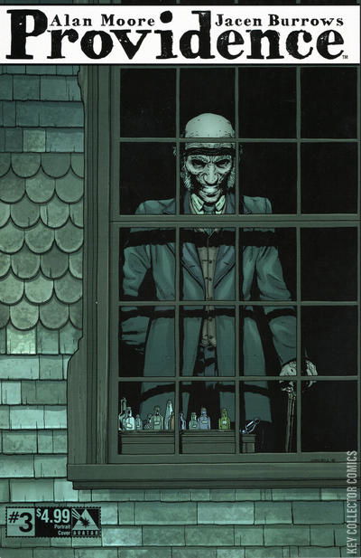 In this super-sized, ad-free, third issue, Alan Moore continues to re-define horror in this amazing tome of Lovecraftian influenced nightmares. Providence is an amazing and unique work where Moore has written every cover, every single page, and every nuance of this work to create his most fully-realized vision to date. In this issue, 'A Lurking Fear', Robert Black visits the Bogg's Refinery in Salem and is introduced to some most peculiar-looking local folks. And a few denizens with very bad intentions. Available with Regular, Pantheon, Portrait, Dreamscape Wraparound, Women of HPL, and a special Ancient Tome Incentive cover, all by collaborator Jacen Burrows.