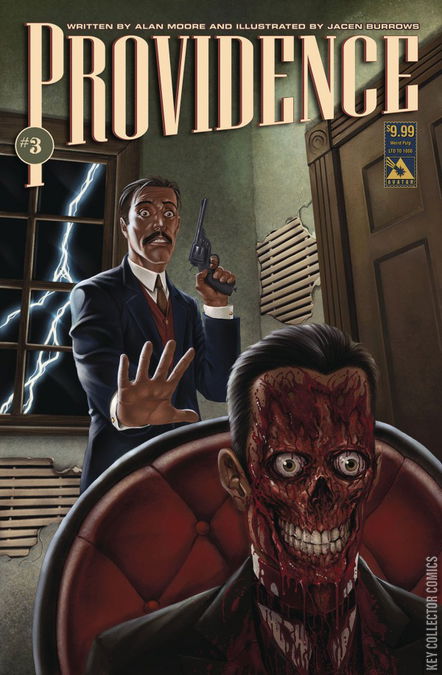 In this super-sized, ad-free, third issue, Alan Moore continues to re-define horror in this amazing tome of Lovecraftian influenced nightmares. Providence is an amazing and unique work where Moore has written every cover, every single page, and every nuance of this work to create his most fully-realized vision to date. In this issue, 'A Lurking Fear', Robert Black visits the Bogg's Refinery in Salem and is introduced to some most peculiar-looking local folks. And a few denizens with very bad intentions. Available with Regular, Pantheon, Portrait, Dreamscape Wraparound, Women of HPL, and a special Ancient Tome Incentive cover, all by collaborator Jacen Burrows.
