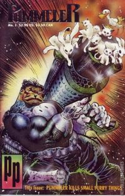 Story by Mike Baron, Ross Turner, Sam Kieth, Don Chin, and Sam Agro. Art by Sam Agro and Dave Feiss. Cover by Sam Kieth and Bill Maus. Another superhero spoof by Parody Press, this one a send-up of Marvels Punisher. A crazed ex-cop wages a one-man war on crime in between plentiful flashbacks to his origin story. Also featuring spoofs of other comics done in the style of The Punisher, including Peanuts, Family Circus and Archie (preceding The Punisher Meets Archie by a year or so). The Pummeler Bore Journal; The Pummelers Day Off; The Mumbler; Wash and Die; The Funny Pages. 32 pages, B&W.