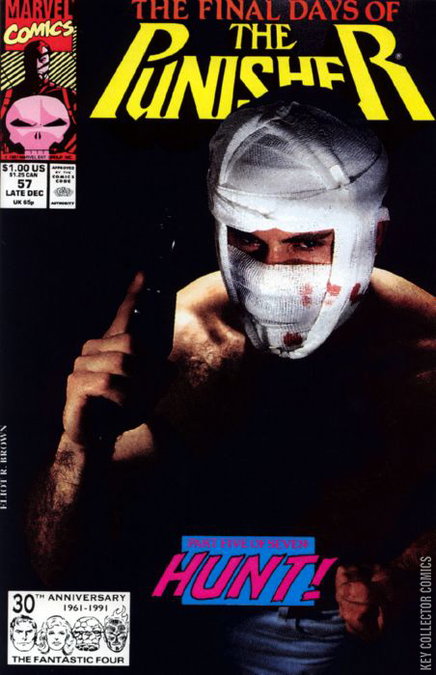 The Finals Days, Part Five - "America's Most Hunted."On the run after escaping Rikers Island, a disfigured and weak Punisher must seek out Micro for medical help. But Kingpin's men are waiting for Frank to return to his safe house.This issue features two pin-ups. The first pin-up is by Ed Lazellari and Bud LaRosa, featuring Punisher and the Reavers. The second pin-up is by Mark Bagley and Donald Hudson.
