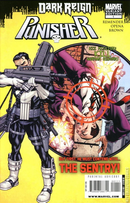 LIVING IN DARKNESS,' PART 1The fight against the 'Dark Reign' begins as the duty of chronicling Frank Castle's war journal is passed to new regular team of writer Rick Remender (End League, Fear Agent) and Jerome Opeña (Wolverine, Fear Agent). One man with one bullet, in the right place, at the right time, can change the world. That's why the Punisher is perched atop a building on the Jersey shore with a high-powered Skrull rifle, his crosshairs trained on a target in Midtown Manhattan. But who is his target -- and why? One thing's for sure: They're anything but helpless. Someone is watching their back. Someone big. Enter: The Sentry!