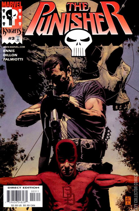 The Punisher's war on low-life crime continues as he sets his eye, as well as his rifle scope, on mob boss Ma Gnucci's favorite son! Who could possibly come between one of the Punisher's targets and a bullet? Only Daredevil, the Man Without Fear! Third part of Welcome Back Frank. The Punisher faces Daredevil at the docks. Came bagged with Marvel Knights / Marvel Boy: Genesis Edition flipbook with sketches and quotes from various creators.