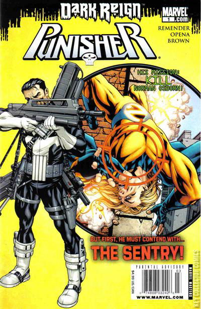 LIVING IN DARKNESS,' PART 1The fight against the 'Dark Reign' begins as the duty of chronicling Frank Castle's war journal is passed to new regular team of writer Rick Remender (End League, Fear Agent) and Jerome Opeña (Wolverine, Fear Agent). One man with one bullet, in the right place, at the right time, can change the world. That's why the Punisher is perched atop a building on the Jersey shore with a high-powered Skrull rifle, his crosshairs trained on a target in Midtown Manhattan. But who is his target -- and why? One thing's for sure: They're anything but helpless. Someone is watching their back. Someone big. Enter: The Sentry!