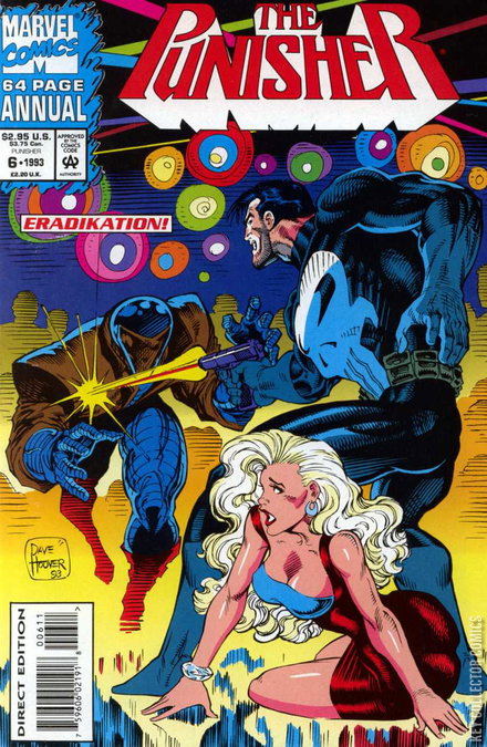 1993 Annual that originally came sealed with a card. All 1993 Marvel annuals introduced a new character. The card included featured the new character Eradikator. This annual contains three stories and five pin-ups.The pin-ups included were by Andy Wildman and George Wildman; Ken Branch and Jason Temujin; Ken Branch; Scott Kolins and Ken branch; and McDuffy and Josef Rubenstein. The first four were colored by Sue McTeigue. The last pin-up was colored by Kevin Somers."Death Metal"by Pat Mills, Tony Skinner, Dave Hoover, Ken Lopz, and Daisy DeputhodWhen Frank's discovers that one of his war buddies has been killed, Punisher uncovers plot to do away with the rest of his friend's family. Punisher must protect the next victim before Eradikator 4 gets to him."Preacher"by Stephen Grant, Shawn McManus, Ken Lopez, John and KaaliszA New high-tech gun has been designed and Punisher must stop it from falling into the wrong hands."Tracers"by Chuck Dixon, Dale Eaglesham, Pat Redding, and Richard StarkingsKnocking off gangsters isn't always easy. Punisher is pursued by gangsters after a recent hit.