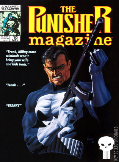 Reprints reg. Punisher #13 & 14. Painted cover art by Joe Jusko. The Punisher #11 cover reprint, pencils by Whilce Portacio, inks by Scott Williams. "Second Sight," script by Mike Baron, pencils by Whilce Portacio, inks by Scott Williams; The Punisher is wounded while saving a Mexican girl from a gang of ruthless coyotes (the human kind) and is nursed back to health by a local medicine man. Punisher illustration by Bob Hall. Punisher illustration by Dan Reed. The Punisher #14 cover reprint, pencils by Whilce Portacio, inks by Scott Williams. "Social Studies," script by Mike Baron, pencils by Whilce Portacio, inks by Scott Williams; The Punisher goes undercover as a substitute teacher to take on a student gang being controlled by the Kingpin. 52 pgs., B&W.