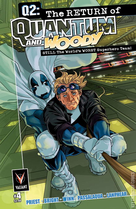 Back together! Back in the tights! Back in action! Christopher Priest & MD Bright’s long-awaited return to the world’s worst superhero team hits full swing! Quantum and Woody suit up and zero in on the mystery that may have caused the new Quantum to disappear…and the new Woody to exist in the first place! But Eric Henderson knows more than he’s letting on. Can Woody trust his one-time partner again…and together can they manage to stop the global intelligence networks and their worldwide conspiracy?