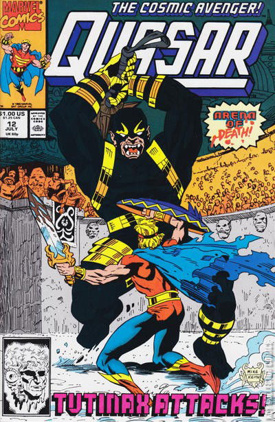 Quasar accompanies a recovered Makkari to Lemuria to rescue Master Elo. Once there, Quasar becomes embroiled a gladiatorial contest. Tutinax appears to Quasar as his father, who he can't fight, so Makkari rescues him. Gilbert Vaughn dies.