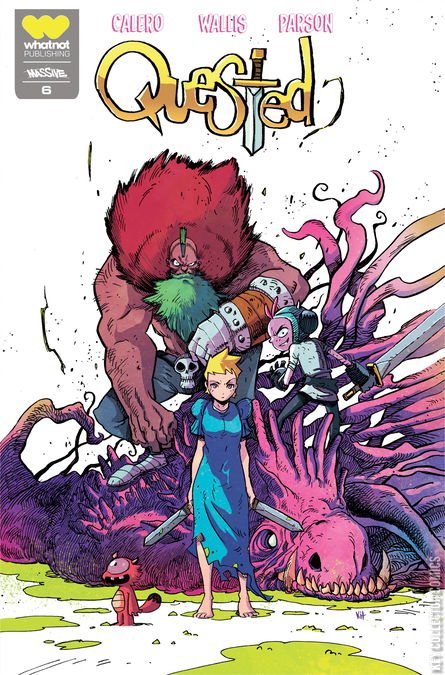 Cover by series artist Kit Wallis. Quested fuses the attitude of Hellboy and the fantasy-adventure spirit of Legend of Zelda as it follows the questing misadventures of pawn shop owner and morally ambiguous hero-for-hire, Jinx, through a world filled with lizard henchmen, dungeon-bosses, and unicorn burgers!