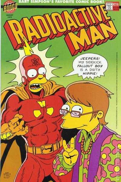 Far out, man! Bongo takes another time trip to present this ultra-relevant early-1970s issue! Radioactive Man, the upright and uptight defender of the Silent Majority, faces the most difficult challenge of his career when Fallout Boy becomes a hippie! Stunned by his sidekick's sudden conversion to the dark forces of peace and love, the irradiated crusader sets out on a quest to find America and save Fallout Boy from the clutches of the nattering nabobs of negativism!