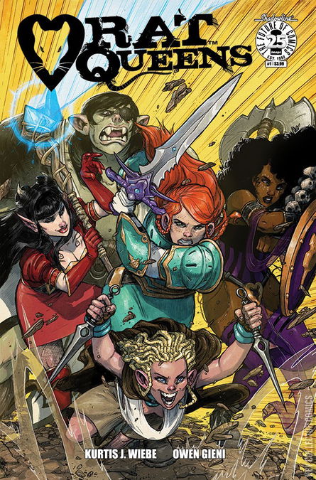 “CAT KINGS AND OTHER GARYS,” Part One The Rat Queens are back! Betty, Violet, Dee, Braga, and Hannah return! Palisade is still a rat-infested troll’s ass, and everyone still hates Gary. It’s been a while since the Queens have done a good slaughter, so join them as they get back to the basics of killing monsters and drinking away the profits! A fresh, soft reboot to the head for the Rat Queens with artist OWEN GIENI!