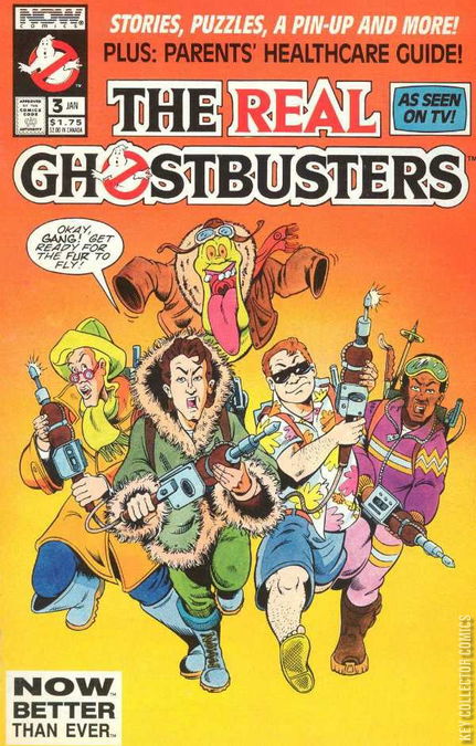 Now Comics relaunches its adaptation of the popular 1980s cartoon, featuring reprints from Marvel UKs Real Ghostbusters comics. The Ghostbusters are reunited with pieces of the puzzle to aid Tobin, in a story continued from the previous issue; the teams headquarters is haunted by a ghost mouse. Plus puzzles, games and a health guide for parents.