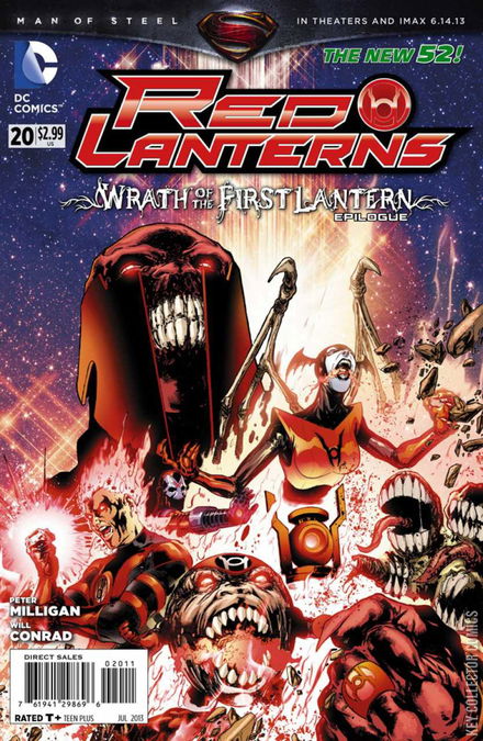 'WRATH OF THE FIRST LANTERN' epilogue! Following the battle against the First Lantern and the Guardians, for the first time in centuries Atrocitus feels peace. What could possibly calm his legendary rage? And more importantly, what does that mean for the Red Lanterns? A surprising turning point for Atrocitus and the Red Lanterns in this, the conclusion of Peter Milligan's run!