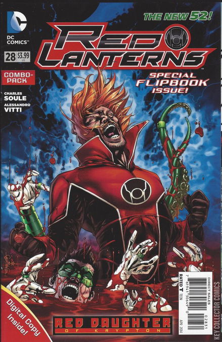 With dozens of sectors in open rebellion against the Green Lantern Corps, Hal Jordan is faced with a crisis in the sector most important to him: 2814, home of Earth…as well as Ysmault, home of the Red Lanterns. Hal made a dangerous bargain with Guy Gardner, and now it’s time to pay up! Plus: Guy and the Red Lanterns take over policing Sector 2814! NOTE: This flipbook double issue contains both Green Lantern #28 and Red Lanterns #28.