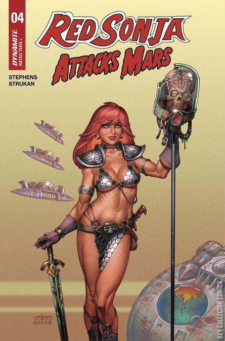 It's nonstop, page-turning action in this fourth and final issue detailing the weirdest war ever witnessed in the Hyborian Age! The White Apemen of Mount Bori join the She-Devil's side against the Arean Invaders, and Martian battles Martian when one bulging-brained attacker is possessed by the ancient serpent god Set and emerges flanked by snake-filled Martian mummies as the all-powerful conqueror, MAR-SET-AHKS! Witness the unbridled carnage of the resulting alien apocalypse in the feverish finale of Red Sonja Attacks Mars breathlessly broadcast by JAY STEPHENS and FRAN STRUKAN, with captivating color commentary from JOSEPH MICHAEL LINSNER, JAE LEE & JUNE CHUNG, and GREG LAND!