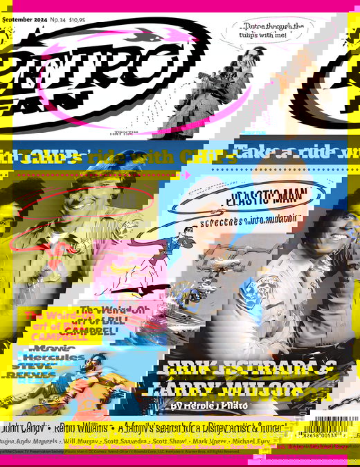 Take a ride with CHiPs’ Erik Estrada and Larry Wilcox, courtesy of Herbie J Pilato! Plus: an interview with movie Hercules Steve Reeves, Weird-Ohs cartoonist Bill Campbell, Plastic Man on Saturday mornings, Tiny Tim, Remo Williams, the search for a Disney artist, and more! Featuring columns by Andy Mangels, Will Murray, Scott Saavedra, Scott Shaw, and Mark Voger. Edited by Michael Eury.