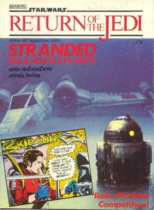 Return of the Jedi Weekly 64 is the sixty-fourth issue of Return of the Jedi Weekly, the continuation of the Marvel Star Wars UK series. This issue reprints part one of the story printed in the US as Star Wars 86: The Alderaan Factor, along with part three of Star Wars 44: The Empire Strikes Back: Duel a Dark Lord.